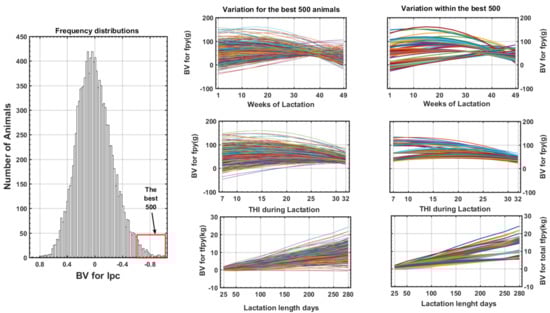Druet et al. [] applied the same approach when studying monthly milk production records, considering ef1 as an indicator of the general genetic level and ef2 as the persistence of lactation. These authors highlighted the usefulness of efi in the selection process of Holstein cattle in France. The trends of the coefficients presented in (Figure 6) follow the same pattern but related to the production of fpy throughout the scale of DIM and THI level. The selection of the best 500 animals according to Ipc is consistent with this point of view, and we have shown (Figure 7 and Supplemental Figures S1 and S2) that it is possible to identify the animals with the highest genetic merits across both trajectories. The use of the results from the Ipc allow us to attenuate the restricted effect of DIge presented in this study and, at the same time, we can exploit the additional information related to genetic variations in the type of response in order to identify the animals best adapted to the different production systems.