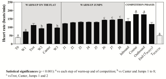To evaluate the workload during the competition, each horse was equipped with equine HR monitors (Polar Horse Trainer, S 610, Polar Electro Europe BV, Fleurier Branch, Avenue Daniel-Jeanrichard, Switzerland) to record HR during each step of the warm-up and competition. Two electrodes were placed against the horse’s wet coat: the positive electrode was first placed under the saddlepad, the negative electrode was then fixed to the saddle girth on the left side of the thorax, and finally the electrodes were connected to a transmitter (T51H, Polar Electro Oy, Kempele, Finland), fixed to a breast strap, that transmitted data to a watch-type data logger (Polar S-610I, Polar Electro Oy, Kempele, Finland), placed near the electrodes. Recorded data were then downloaded on a personal computer, by using the Polar Equine 4.0 software (Kempele, Finland), to be analyzed. In particular, HR was logged every 5 s during the whole exercise. The values of HR measured before the exercise event at rest (T0); during each step of warm-up, including walk, trot, canter, and jumps 1–8; and competition, including inbound, course, outbound, and end of the competition stage (5 min ± 10 s) following the cessation of the exercise, TPOST5); and 30 min after the end of the competition (TPOST30).