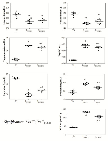 Serum amino acids (e.g., tryptophan, leucine, valine), Try/BCAAs ratio, NEFAs, dopamine, and prolactin values measured in each competing horse before the exercise event (T0), at the end of the competition stage (5 min ± 10 s) following the cessation of the exercise, TPOST5), and 30 min after the end of the competition (TPOST30).