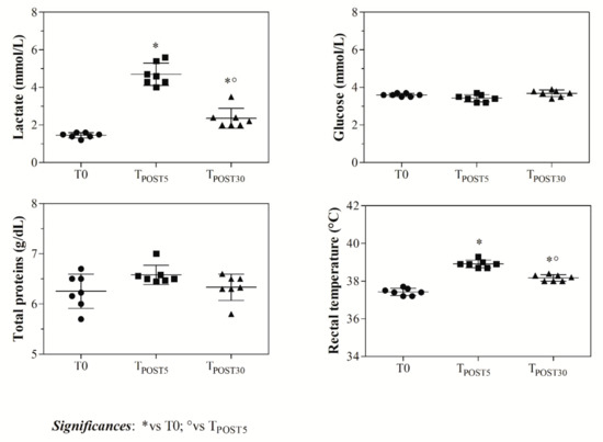 Blood lactate and glucose concentration, serum total protein, and rectal temperature values measured in each competing horse before the exercise event (T0), at the end of the competition stage (5 min ± 10 s) following the cessation of the exercise, TPOST5), and 30 min after the end of the competition (TPOST30).