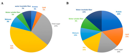 The nutritional composition of the fermented rakkyo. (A) The proportions of nutritional ingredients of the solution of fermented rakkyo residual powder. (B) The proportions of nutritional ingredients of fermented rakkyo residual liquid without adding dextrin sugar.