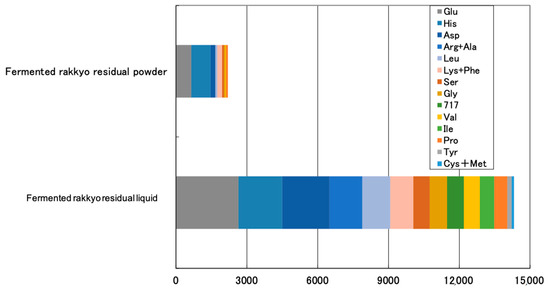 The amino acid components of fermented pickled rakkyo residual liquid showed a remarkable difference when compared with that of the fermented residual powder (Figure 2). The fermented rakkyo residual powder sample showed the presence of eight amino acids: glutamine (658 mg/100 g), histidine (818 mg/100 g), aspartate (192 mg/100 g), leucine (82 mg/100 g), lysine + pheonine (202 mg/100 g), serine (86 mg/100 g), glycine (62 mg/100 g), valine (25 mg/100 g), and proline (74 mg/100 g). The levels of amino acids were significantly higher in the fermented rakkyo residual liquid as compared to that of fermented residual powder. The fermented rakkyo residual liquid showed 15 amino acids (including the eight contained in fermented residues): glutamine (2650 mg/100 g), histidine (1859 mg/100 g), aspartate (2005 mg/100 g), arginin + alanin (1383 mg/100 g), leucine (1188 mg/100 g), lysine + pheonine (974 mg/100 g), serine (700 mg/100 g), glycine (734 mg/100 g), threonine (717 mg/100 g), valine (664 mg/100 g), isoleucine (622 mg/100 g), proline (531 mg/100 g), tyrosine (201 mg/100 g), and cysteine + methionine (89 mg/100 g) (Figure 2).