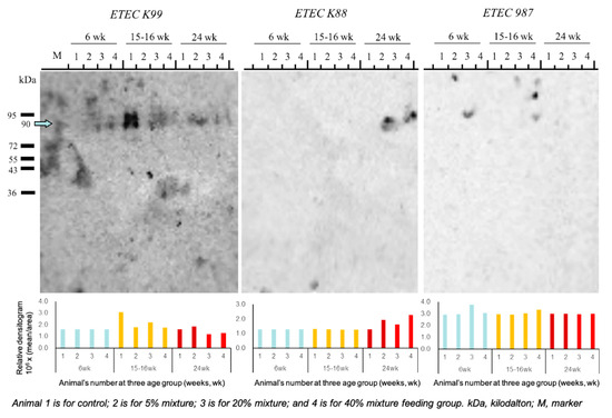 Enterotoxigenic E. coli is one of the major bacterial pathogens causing severe diarrhea in pigs. In order to evaluate the effect of immunobiotic feeding on gut-health status, the presence of diarrheic symptom and the western blot-based detection of K88, K99, and 987P ETEC strains in the fecal samples collected at 6, 16, and 24 weeks of age during the feeding trial were investigated. The pigs from the control group were affected with diarrhea at 16 weeks of their age, while none of three immunobiotic treated groups experienced any diarrhea (Figure 4). The western blot analysis confirmed that the pigs from the control group had enteric infections at 16 weeks of their age while the other three groups of immunobiotic treated pigs had no E. coli infection throughout the feeding trial period (Figure 4).