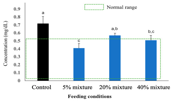 The c-reactive protein (CRP) is a plasmatic protein of the pentraxin family and an acute phase reactant that is useful as a general inflammation marker. The plasma CRP levels in physiologically normal pigs ranges between 0.02 and 0.52 mg/dL [30]. The plasma CRP concentrations measured in pigs at 17 weeks of age are presented in Figure 5. The highest CRP levels were estimated in plasma of control pigs and the values were above the normal range. The pigs treated with 5% mixed pickled juice demonstrated the plasma CRP level within the normal ranges of estimates, and the value was significantly lower than control group and the group treated with 20% mixture of pickled juice with residue. The CRP level of pigs treated with 20% mixture of pickled juice and residue was estimated as slightly above the normal range, but significantly lower than the control group. The CRP level of pigs treated with 40% mixture (20% juice and 20% residue) pickled juice was estimated within the normal range but still significantly higher than the group treated with 5% mixture of pickled juice and residue. There was no significant difference in plasma CRP level between the group treated with 20% mixture and 40% mixture of residues and pickled juice (Figure 5).