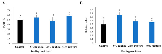 A higher phagocytic activity of macrophages is an indicator of general inflammatory status of the body. The phagocytic activity of macrophage was increased in pigs treated with immunobiotic pickled juice compared to the pigs of control group (Figure 6A). Among the treated groups, the macrophage activity was higher in 5% mixture group and 40% mixture group than 20% mixture group (Figure 6A).