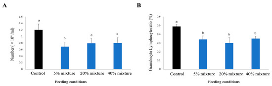 The increment of WBC count is an indicator of the presence of generalized infectious or noninfectious inflammatory stress in the body. The pigs tread with both 5% and 20% mixture of pickled juice with residues had WBC counts within the normal ranges of estimates, and the values were significantly lower than that of control group (Figure 7A). The WBC count showed an increasing trend in the group treated with 5% mixed pickled juice was the lowest among all study groups. The 40% mixture group showed WBC count lower than that of control group but higher than those of other treated groups, but none of the differences are statistically significant (Figure 7A).