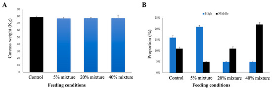 In order to determine the market price of pork, the overall carcass quality was ranked as high, medium or low, based on quality parameters measured at the slaughterhouse. Only the high-ranked and medium-ranked proportion of meat are shown in Figure 8B. In the control group, the proportion of high-ranked meat yield was higher than the proportion of medium-ranked meat. The proportion of high-ranked meat yield was significantly increased, and the medium-ranked proportion was significantly decreased in 5% mixture group when compared with control group (Figure 8B). On the other hand, both 20 mixture group and 40% mixture group, the ratio has significantly changed, the proportion of high-ranked meat yield was reduced, and the medium-ranked proportion was increased when compared with 5% mixture group as well as control group (Figure 8B).