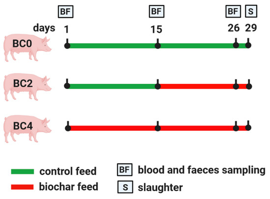 After a five-day adaption period, during which all animals received CON, the animals were divided into three groups. The experimental period lasted a total of four weeks. The control group (BC0) received CON over the entire experimental period. The second group (BC2) received CON during the first two weeks and BCF for the last two weeks of the trial, whereas the third group (BC4) received the BCF over the entire experimental period of four weeks. At the end of each trial, all animals were slaughtered. Body weight was measured weekly at the beginning of each experimental week and one day before slaughter. Blood samples and faecal samples for determining skatole (S) and indole (I) concentrations were collected at day 1, 15 and 26. Blood samples were taken by puncturing of the anterior vena cava using plasma monovettes (S-Monovette® K3 EDTA, 9 mL, Sarstedt AG & Co., Nümbrecht, Germany). Faecal samples for measuring dry matter content and pH-value of the faeces were collected at day 1, 8, 15, 22 and 26. Furthermore, samples from subcutaneous fat were obtained from the neck region of each animal as described by Mörlein et al. [38] one day after slaughter. Figure 1 shows the experimental procedure.