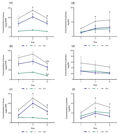 Similar to faecal S, also the plasma concentration of S increased from day 1 to day 15 in BC0 (p = 0.021) and BC4 (p = 0.001) but not in BC 2 (p = 0.804). Furthermore, in BC0 and BC4, plasma I was significantly increased at both day 15 and day 26 compared to day 1 (p < 0.05). Plasma S + I increased from day 1 to day 26 in BC0 (p = 0.043) and BC4 (p = 0.008). Figure 2 graphically shows the course individual of S, I and S + I concentrations in faeces and plasma, for each treatment (BC0, BC2 and BC4, respectively).