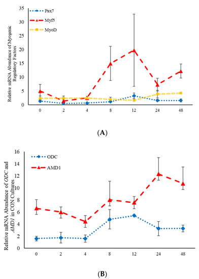 Relative mRNA abundance of the myogenic regulatory factors (A): paired box transcription factor 7 (Pax7), myogenic factor 5 (Myf5), and myogenic differentiation factor 1 (MyoD) and relative mRNA abundance of the two rate limiting steps involved in the polyamine biosynthesis pathway (B): S-adenosylmethionine decarboxylase (AMD1) and ornithine decarboxylase (ODC) from control-treated primary bovine satellite cells cultures over time. Abundance was measured 0, 2, 4, 8, 12, 24 and 48 h after treatment, as described in the Materials and Methods.