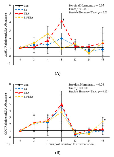 The mRNA abundance of genes involved in the polyamine biosynthesis pathway (ODC and AMD1) was affected (p < 0.05) by treatment with the hormones found in anabolic implants (Figure 3). Additionally, a steroidal hormone*time interaction (p = 0.003) was observed for AMD1 (Figure 3A). Eight hours post-induction to differentiate, AMD1 abundance was increased (p = 0.006) when BSCs were treated with TBA (Figure 3A). Estradiol decreased (p = 0.02) abundance of ODC 12 h post-induction to differentiate (Figure 3B) compared to control cultures. There was also an effect (p < 0.05) of time on abundance of both AMD1 and ODC (Figure 3). Abundance of AMD1 increased (p < 0.05) at 4 and 8 h post-induction to differentiate, then decreased after that time. Similarly, abundance of ODC increased from 2 to 8 h post-induction to differentiate, then decreased after that time point. These data demonstrate that the steroidal hormones found in anabolic implants impact abundance of the two main rate limiting enzymes in the polyamine biosynthesis pathway. Furthermore, abundance of these enzymes changes over time following induction of differentiation.