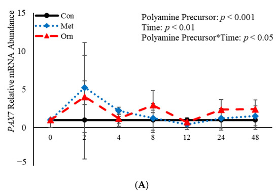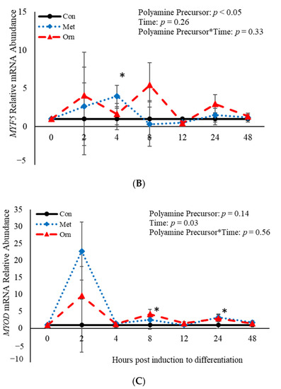 No effect (p > 0.05) of the interaction between polyamine precursor*time was observed in mRNA abundance of MYF5 or MYOD, however there was a polyamine precursor*treatment effect (p = 0.04) observed for PAX7 mRNA (Figure 4). Relative mRNA abundance of PAX7 was affected (p < 0.001) by treatment when a polyamine precursor when analyzed as a repeated measure. However, neither polyamine precursor affected (p > 0.05) abundance of PAX7 compared to the control cultures at any of the analyzed time points (Figure 4A). Additionally, mRNA of MYF5 was affected (p = 0.05) by treatment with polyamine precursors (Figure 4B). Compared to control cultures, MET increased (p = 0.05) abundance of MYF5 4 h post-induction to differentiate (Figure 4B). No effect (p > 0.05) of treatment with polyamine precursor was observed in abundance of MYOD. However, MET increased (p = 0.008) MYOD abundance 24 h post-induction to differentiate compared to control cultures (Figure 4C). Additionally, ORN increased mRNA abundance of MYOD 8 h (p = 0.05) and 24 h (p = 0.007) post-induction to differentiate compared to control cultures (Figure 4C). Myogenin was not expressed by any of the cultures at any time point assessed. Abundance of both PAX7 and MYOD was affected (p < 0.05) by time such that expression of each gene was increased (p < 0.05) 2 h post-induction to differentiate and then decreased after that time point. The data presented here demonstrate that polyamine precursors generally increase abundance of genes involved in BSC differentiation.