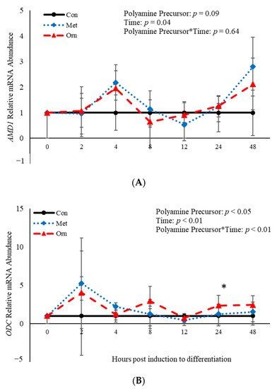 No effect of polyamine precursor (p > 0.05) or polyamine precursor*time interaction (p > 0.05) was observed relative to AMD1 mRNA abundance (Figure 5A). However, an effect of polyamine precursor (p = 0.03), time (p < 0.001) and their interaction (p = 0.008) was observed on abundance of ODC mRNA (Figure 5B). Twenty-four h post-induction to differentiate, ORN increased (p = 0.04) abundance of ODC when compared to control cultures (Figure 5B). Additionally, abundance of AMD1 and ODC were both affected (p < 0.05) by time (Figure 5). Abundance of AMD1 increased 4 h after induction of differentiation and then decreased after that time, whereas abundance of ODC increased 2 h after differentiation was induced and decreased after that time (Figure 5). Taken together, these data demonstrate that treatment with polyamine precursors effects abundance of ODC but has no effect on AMD1 temporally.