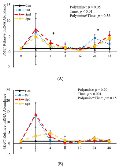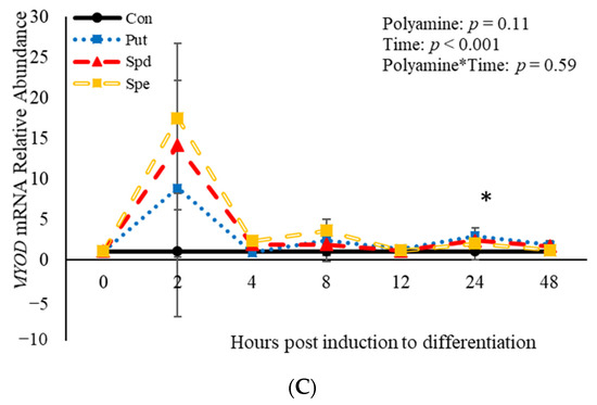 No effects (p > 0.05) of the interaction between polyamine*time were observed relative to mRNA abundance of PAX7, MYF5, or MYOD (Figure 6). However, treatment with polyamines affected (p = 0.05) abundance of PAX7 when analyzed as a repeated-measures (Figure 6A). Specifically, abundance of PAX7 was increased (p = 0.02) 4 h post-induction to differentiate by SPD (Figure 6A), and 24 h (p = 0.002) post-induction to differentiate by PUT (Figure 6A). Despite the increase in abundance by SPD and PUT, SPE decreased (p = 0.04) abundance of PAX7 12 h post-induction to differentiate (Figure 6A) compared to control cultures. Although there was no effect (p > 0.05) of polyamine on abundance of MYF5 when analyzed as a repeated measure, SPE increased (p = 0.02) abundance of MYF5 4 h post-induction to differentiate, but decreased (p = 0.05) abundance of MYF5 12 h post-induction to differentiate when compared to control-treated cultures (Figure 6B). Similarly, there was no effect (p > 0.05) of polyamine treatment on abundance of MYOD when analyzed as a repeated-measures (Figure 6C). However, PUT increased (p = 0.04) abundance of MYOD 24 h post-induction to differentiate (Figure 6C). Additionally, abundance of PAX7, MYF5 and MYOD were each affected (p < 0.05) by time. Abundance of PAX7 increased (p < 0.05) 2 h post-induction to differentiate then decreased after that before increasing (p < 0.05) again 48 h post-induction to differentiate (Figure 6A). Myogenin was not expressed in any of the cultures at any time point assessed. Abundance of both MYF5 and MYOD mRNA increased 2 h post-induction to differentiate then decreased after that time (Figure 6B,C). Overall, these data demonstrate that polyamines generally increase expression of genes involved in BSC differentiation in a temporal manner.