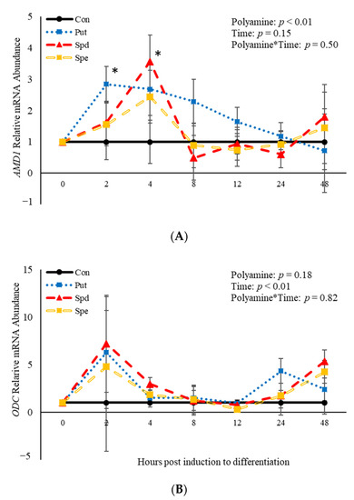 No polyamine*time interactions (p > 0.05) were observed relative to mRNA abundance of AMD1 or ODC (Figure 7). However, there was an effect (p = 0.04) of polyamine treatment where PUT increased (p = 0.02) abundance of AMD1 2 h post-induction to differentiate (Figure 7A). Additionally, SPD increased (p = 0.02) abundance of AMD1 compared to control cultures 4 h post-treatment (Figure 7A). There was no effect (p > 0.05) of time on abundance of AMD1 (Figure 7A). In contrast, there was an effect (p = 0.008) of time on abundance of ODC. However, there was no effect (p > 0.05) of polyamine treatment (Figure 7B). Abundance of ODC increases (p < 0.05) 2 h post-induction to differentiate then decreased after that time before increasing (p < 0.05) again at 48 h (Figure 7B). The data presented here demonstrate that ODC is not altered by polyamines, while both PUT and SPD alter mRNA abundance of AMD1 in BSCs induced to differentiate.
