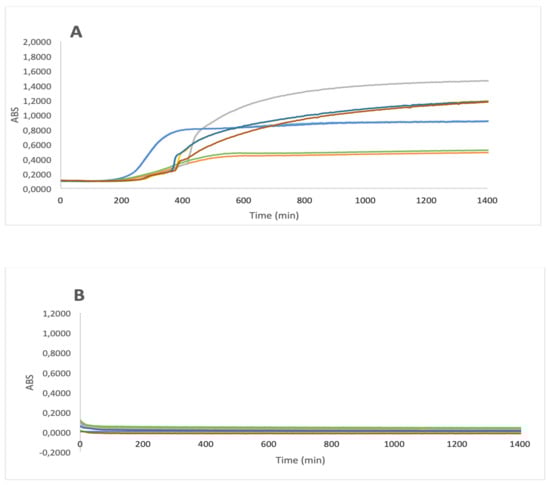 Bacterial growth of Staphylococcus aureus ATCC 29,213 (—), S. aureus 393 (—), Pseudomonas aeruginosa L2 (—), P. aeruginosa L4 (—) in the absence (A) and presence (B) of Iron Animals. ABS (arbitrary units) = optical density OD600 − blank OD600.
