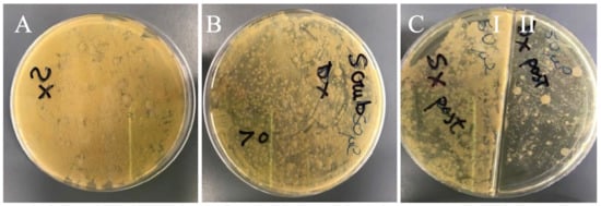 The efficacy of IA in eliminating microorganisms on horse hoof can be appreciated by observing the bacterial growth on Petri dishes. Left front hoof sole was used as control and sampled after a superficial cleaning. Results showed a very high bacterial load from a mixed non-countable microbial flora (Figure 2A). In contrast, the right front hoof sole was treated with two consecutive 3 min scrubs with PI. Moreover, in this second sample, a very high non-countable bacterial load from mixed microbial flora was present (Figure 2B). However, a slightly lower bacterial content, evident from the lighter color, was observed regarding the control fragment (Figure 2A). Figure 2(CI,II) compare the results obtained on the rear hooves. The sample obtained by the left rear hoof sole after a superficial cleaning showed a very high non-countable bacterial load of mixed microbial flora (Figure 2(CI)); while the right rear hoof sole, treated with the application of 10 mL of IA for 15 min (Figure 2(CII)), showed a significantly lower bacterial load and a superior antibacterial effect when compared to the sample treated with PI (Figure 2B).