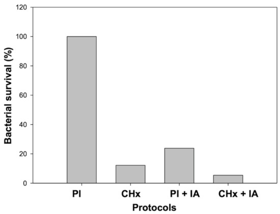 Representation of the average residual bacterial load after different protocols. Data were normalized for the residual bacterial load achieved in Povidone-iodine (PI) protocol, which was used as a reference procedure and referred to as 100%. PI: two consecutive 3 min scrubs with PI; Chlorhexidine (CHx): two consecutive 3 min scrubs with CHx; PI + Iron Animals (IA) and CHx + IA represent PI and CHx protocol followed by the application of 10 mL of IA for 15 min.