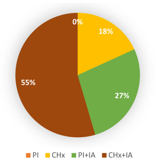 A graphical representation of the number of cases, in which each protocol achieved the lowest bacterial load, is presented in Figure 4. The treatment comparison was carried out on the hooves within every single animal. Thus, the variability among different horses was avoided, in terms of both bacterial communities and microbial loads. As shown in Figure 4, a comparison were done between the treatments and their effectiveness in reducing the bacterial load and the results showed that the use of two consecutive 3 min scrubs of PI was not sufficient for correct disinfection of the equine hoof; PI alone was found to be the worst disinfectant treatment (0% of success). The use of CHx alone resulted in the best treatment in 18% of cases. The application of IA, after PI or CHx scrubs, implemented the bactericidal activity of both disinfectants. Indeed, PI + IA and CHx + IA resulted in the best treatments in 27% and 55% of cases, respectively, with a total improvement of 82% of cases following the use of IA.