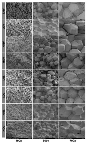 A Hitachi SU8010 SEM (Hitachi High-Technologies, Tokyo, Japan) was used in this study with instructions. For each sample observed by SEM, micrographs at different magnifications (100×, 300×, 700×) were recorded. Each magnification that had 3 micrographs was analyzed, indicating each treatment with 9 micrographs.