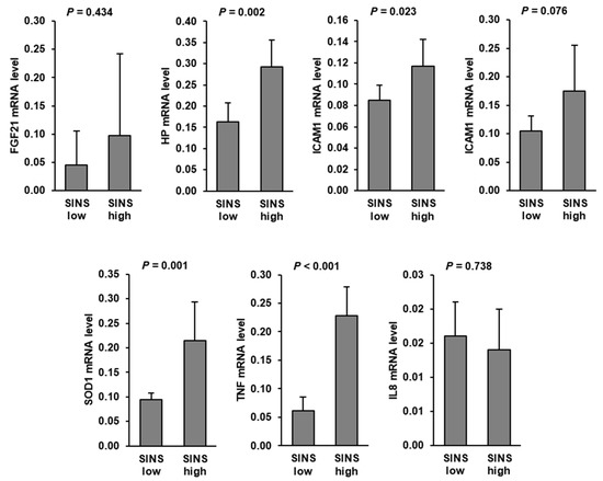 Hepatic mRNA levels of TNF, SOD1, HP, and ICAM1 were significantly increased in suckling piglets of the SINS high group compared to those of the SINS low group. In addition, hepatic mRNA level of IL6 tended (p < 0.1) to be increased in the SINS high group compared to the SINS low group. No differences were found between groups regarding hepatic mRNA levels of FGF21 and IL8 (Figure 1).