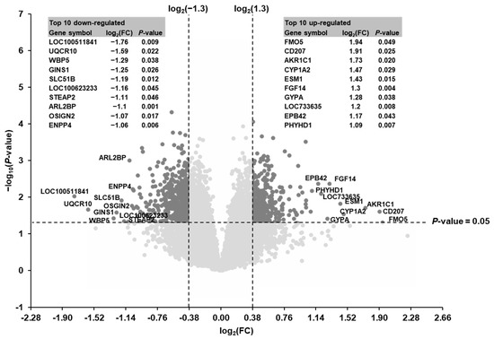 Volcano plot illustrating the differentially regulated transcripts in the liver of suckling piglets between the SINS high group and the SINS low group. The double filtering criteria are indicated by horizontal (p-value < 0.05) and vertical (FC > 1.3 or FC < −1.3) dashed lines. Transcripts in the upper left and the upper right corner represent the down-regulated and the up-regulated transcripts, respectively. The top 10 up- and down-regulated transcripts are indicated with their gene symbols and log2(FC) and p-values are presented in the tables in the left (down-regulated) and right (up-regulated).