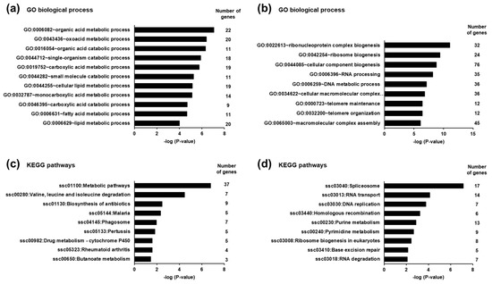 To identify biological processes and pathways affected by the differentially expressed transcripts in the liver of piglets between the SINS high group and the SINS low group, GSEA was performed using GO biological process terms and KEGG pathways, respectively. GSEA of the transcripts up-regulated in suckling piglets of the SINS high group revealed that the most enriched biological process terms were exclusively related to the metabolism of organic acids, such as oxoacids and carboxylic acids including fatty acids. Examples of the most enriched (lowest p-value) terms are organic acid metabolic process, oxoacid metabolic process, and organic acid catabolic process. The biological process terms with p-values < 0.01 including the number of genes assigned to these terms are shown in Figure 3a. GSEA of the transcripts down-regulated in the suckling piglets of the SINS high group demonstrated that the most enriched biological process terms were mainly dealing with ribosome biogenesis, RNA processing, RNA splicing, and telomere organization. Owing to the large number of identified GO terms only those with p-values < 0.0001 including the number of genes assigned to these terms are presented in Figure 3b.