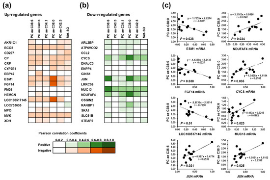 In order to investigate the statistical relationships between altered hepatic genes expression and significantly altered plasma metabolites (PC aa C36:6, PC aa C40:3, PC ae C34:1, PC ae C38:0, PC ae C42:3, Met-SO), regression analysis was carried out. Among the up-regulated genes, the correlations as indicated by Pearson correlation coefficients (r) between hepatic gene expression level and plasma metabolite concentration was weak (r < 0.6), except PC ae C38:0 (Figure 4). Plasma concentration of PC ae C38:0 was found to be negatively correlated with the hepatic expression of ESM1 (r = −0.6031; p = 0.038), FGF14 (r = −0.6027; p = 0.038), and LOC100517145 (r = −0.7098; p = 0.01) (Figure 4). Similarly, among the down-regulated genes correlations between hepatic gene expression and plasma metabolite concentrations were weak (r < 0.6), except PC ae 36:6, which was positively correlated with hepatic gene expression of JUN (r = 0.6539; p = 0.021) and MUC3 (0.6462; p = 0.023), and PC ae C38:0, which was positively correlated with hepatic gene expression of CYCS (r = 0.6108; p = 0.035), JUN (r = 0.6398; p = 0.025), and NDUFAF4 (r = 0.6122; p = 0.034) (Figure 4).