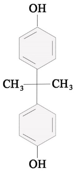 Bisphenol A (BPA) (Figure 1) is a synthetic chemical widely used in the plastics industry since the 1950s, because items made using this substance are relatively cheap, strong and easy to use [,]. BPA is a component of many things for everyday use, including bottles, toys, containers, furniture and many others. BPA is also present in thermal paper and even dental fillings []. It is known that BPA may leach from plastics and penetrate food and water. Due to the widespread use of BPA, this substance pollutes surface water, air and soil all over the world []. BPA also penetrates living organisms through the gastrointestinal tract, skin and respiratory system, as evidenced by the presence of BPA in the blood, urine and tissues of humans and other organisms [,]. In living organisms, BPA binds to the estrogen receptors and, as a strong endocrine disruptor, negatively affects various internal organs and systems [,].