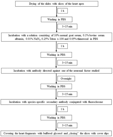 Tissues were subjected to a single immunofluorescence technique used previously by Szymanska et al. []. In this method, commercial antibodies against neuronal factors were studied as well as secondary antibodies conjugated with appropriate fluorochromes (Table 1).