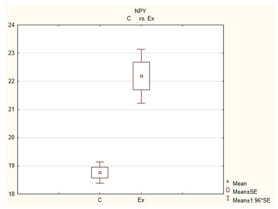 The average number of nerves immunoreactive to neuropeptide Y(NPY) in the porcine heart apex in physiological conditions (C) and after administration of bisphenol (BPA) at a dose of 0.05 mg/kg body weight/day (Ex).