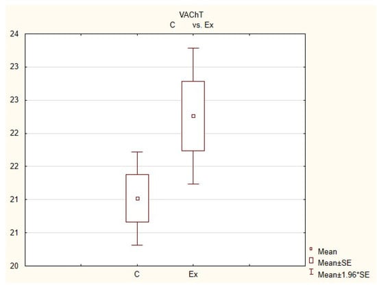 The average number of nerves immunoreactive to vesiculr acetylcholine transporter (VAChT) in the porcine heart apex in physiological conditions (C) and after administration of bisphenol (BPA) at a dose of 0.05 mg/kg body weight/day (Ex).