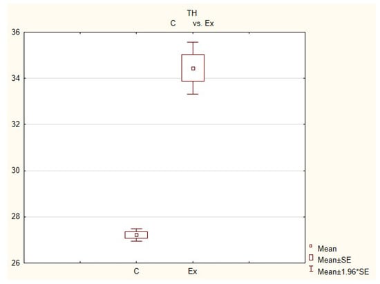 The average number of nerves immunoreactive to tyrosine hydroxylase (TH) in the porcine heart apex in physiological conditions (C) and after administration of bisphenol (BPA) at a dose of 0.05 mg/kg body weight/day (Ex).