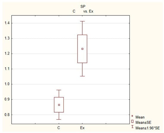 The average number of nerves immunoreactive to substance P (SP) in the porcine heart apex in physiological conditions (C) and after administration of bisphenol (BPA) at a dose of 0.05 mg/kg body weight/day (Ex).