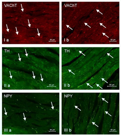 Nerve fibers immunoreactive to vesicular acetylcholine transporter (VAChT), tyrosine hydroxylase (TH) and neuropeptide Y (NPY) in the porcine heart apex under physiological conditions (a) and after administration of bisphenol A in a dosage of 0.05 mg/kg body weight/day (b). Nerves containing particular active substances are indicated with arrows.