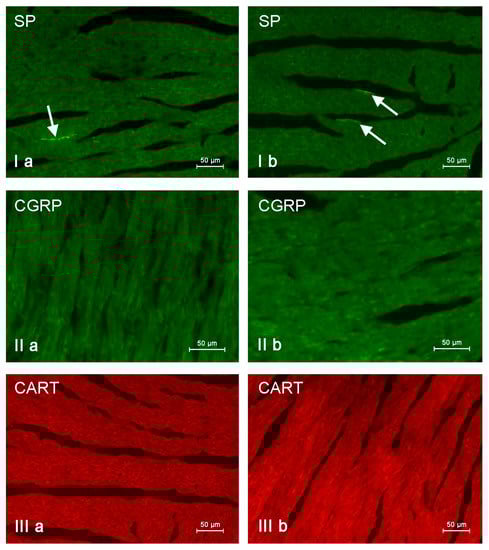 Nerve fibers immunoreactive to substance P (SP), calcitonin gene-related peptide (CGRP) and cocaine- and amphetamine-regulated transcript peptide (CART) in the porcine heart apex under physiological conditions (a) and after administration of bisphenol A in a dosage 0.05 mg/kg body weight/day (b). Nerves containing particular active substances are indicated with arrows.