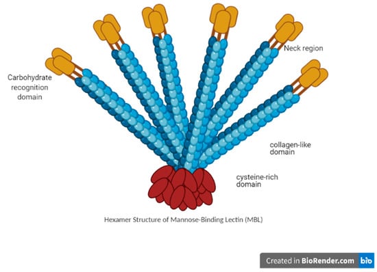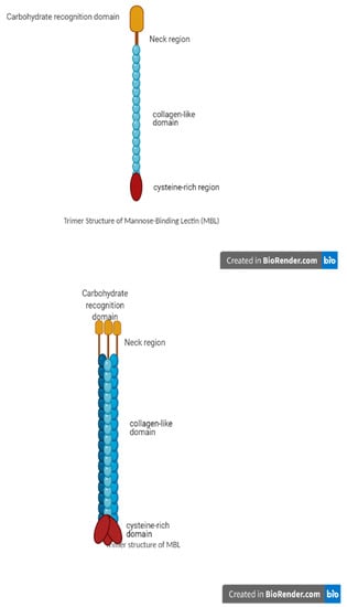 The neck domain initiates trimerization of the monomers which is stabilized by the intertwined collagen of MBL [9,20]. The trimer is considered the smallest active form of MBL (structurally, the smallest form of MBL) [20]. The N-terminal domains can covalently crosslink the MBL trimers via the cysteine residues, to higher oligomeric structures (Figure 2). The International Union of Immunological Societies (IUIS) had not defined a specific oligomeric structure for MBL, and, in nature, several forms of MBL are present across animal species [9,19,20,21]. Laursen et al. [22] observed that purified chicken MBL has a similar structure as mammalian MBL [9,19,20,21].