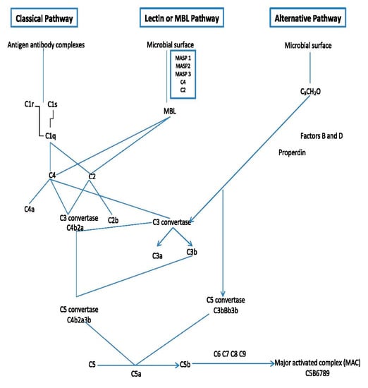 The complement system (CS) plays a very important role in defending the host against diseases and inflammation. It is known that the CS consists of more than 30 soluble or membrane proteins that upon activation interact (the complement cascade), eventually leading to formation of an antibacterial complex of proteins and formation of several signaling molecules that stimulate further immune responses (Figure 3) [6,31].