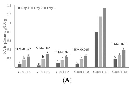 Except for C18:1 trans-11, plasma concentrations of all C18:1 trans isomers increased linearly (p < 0.05) with day of treatment, and were higher (p < 0.05) on day 3 than on days 1 and 2 (Figure 2). C18:1 trans-11 was not increased in plasma but it showed a linear increased across sampling days. This trans isomer is crucial for formation of C18:2 cis-9, trans-11, and for dairy consumers this FA is important because it has potential benefits for human health [4]. Plasma concentrations of C18:1 trans-4 and C18:1 trans-12 were greater (p < 0.05) at 1 h post-rumen pulsing than at other times; concentrations of C18:1 trans-5 were greater (p < 0.05) at 2 h and 6 h post-rumen pulsing than at other times; concentrations of the remaining C18:1 trans isomers were not affected (p > 0.05) by time of sampling (Figure 3).