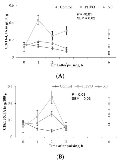 There was no treatment by period interaction for any FA in plasma and lipoproteins. Compared with control and SO, PHVO increased (p < 0.05) plasma concentrations (g/100 g of total FA) of C18:1 trans-4 (0.001 and 0.001 vs. 0.2) and C18:1 trans-5 (0.1 and 0.1 vs. 0.2). However, C18:1 trans-12 was higher (p < 0.05) in SO and PHVO than control (0.3 vs. 0.3 and 0.2). As expected, we detected higher concentrations of C18:1 trans isomers in PHVO pulses.
