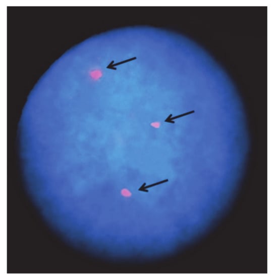 - Di Dio, C.; Longobardi, V.; Zullo, G.; Parma, P.; Pauciullo, A.; Perucatti, A.; Higgins, J.; Iannuzzi, A. Analysis of meiotic segregation by triple-color fish on both total and motile sperm fractions in a t(1p;18) river buffalo bull. PLoS ONE 2020, 15, e0232592. [Google Scholar] [CrossRef]