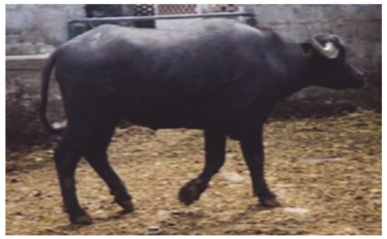 Female river buffalo, five years old, affected by X trisomy (2n = 51, XXX). Note the prominent withers (male trait).
