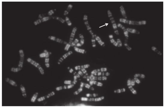 RBA-banding river buffalo metaphase from a female affected by X monosomy (2n = 49,X). The only active X chromosome (arrow) was observed in all metaphases. This female was sterile due to damage to her internal sex organs.