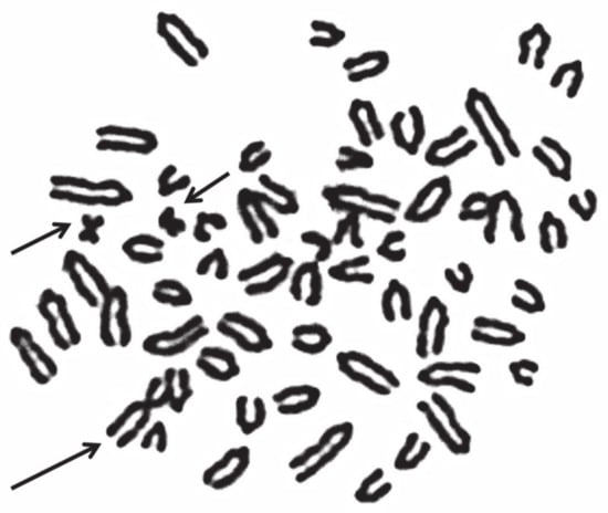 Genetic deletions and duplications have been reported in several studies using genomic approaches and have rarely been reported as chromosome abnormalities. This is probably due to the harmful effects of large genomic losses (deletions) or gains (duplications). These conditions can cause the death of embryos in early embryonic life, especially chromosome deletions. Among the few reported cases of chromosome deletions, only two involved an autosome: the first one in an infertile cow [246] and another one, more recently, in a female calf with several anatomic defects (head asymmetry, relocation of the frontal sinus and eye orbits, hypoplastic thymus without neck part, ductus Botalli, unfinished obliteration in umbilical arteries, and a bilateral series of tooth germs in the temporal region) [247]. In this case, mosaic cells were observed, of which 92% were normal (2n = 60, XX) and 8% abnormal (2n = 60, XX+ mar) due to the presence of a small marker chromosome showing only the centromere and a proximal part due to the deletion of the remaining material [247].