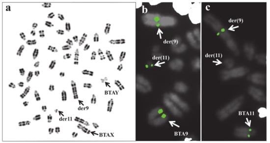 (a) Cattle metaphase treated for RBG banding and showing a case of rcp(9;11) (q27;q11) in a young male for reproduction. Arrows indicate the sex chromosomes der(9) and der(11). FISH mapping with two chromosome-specific BAC clones mapping on BTA9 and BTA11 confirmed the chromosomes involved in the rcp (b,c). Note the presence of FITC signals of a BTA9 marker in BTA9, der(9), and der(11) (b), as well as of FITC signals of a BTA11 marker only in BTA11 and der(9), being absent in der(11) (c) because the chromosome region was positioned after the break point.