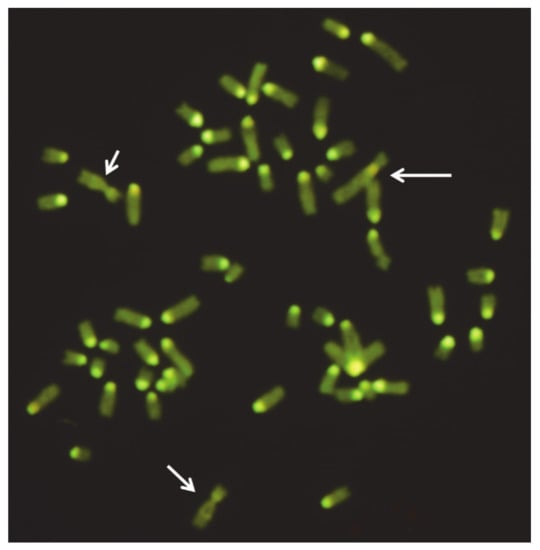 - Bonnet-Garnier, A.; Pinton, A.; Berland, H.M.; Khireddine, B.; Eggen, A.; Yerle, M.; Darré, R.; Ducos, A. Sperm nuclei analysis of 1/29 Robertsonian translocation carrier bulls using fluorescence in situ. Cytogenet. Genome Res. 2006, 112, 241–247. [Google Scholar] [CrossRef] [PubMed]