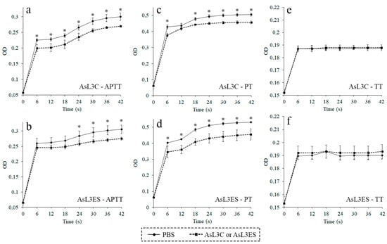 Anticoagulant activity of AsL3C (a,c,e) and AsL3ES (b,d,f) evaluated by measuring the APTT (a,b), the PT (c,d) and the TT (e,f). Plasma from pigs was incubated with 0.5 μg of the antigenic extract (■) or with PBS as a negative control (●), and the corresponding reagent (APTT, PT or TT). Each point represents the mean of three replicates ± SD. Significant differences (p < 0.05) are marked with an asterisk (*).