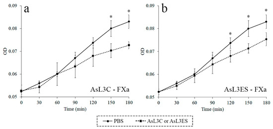 The inhibitory activity of AsL3C and AsL3ES against FXa was studied by a chromogenic assay. Optical densities were significantly lower for AsL3C and AsL3ES extracts than those obtained for the negative controls, which showed the inhibitory properties of both antigenic extracts against FXa over time (p < 0.05) (Figure 2).