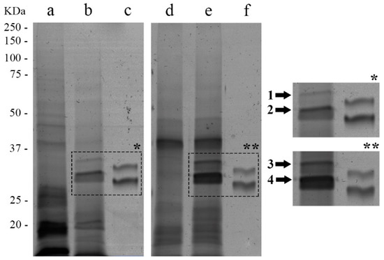 Binding of AsL3C (a–c) and AsL3ES (d–f) to FXa by SDS-PAGE. 10 μg of the antigenic extract (a,d), 10 μg of the antigenic extract + 1 μg of the FXa (b,e) and 1 μg of the FXa (c,f) were pre-incubated in 5 mM HEPES buffer, pH 7.4. The reference of molecular weights is indicated on the left. The bands marked with arrows correspond to the FXa in the samples incubated with AsL3C (*) and AsL3ES (**).