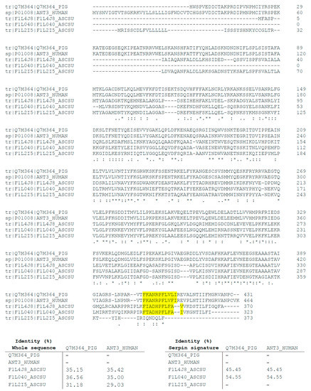 The three identified serpins were also compared by multiple sequence alignment to the physiological inhibitor of FXa in mammals, the antithrombin III from Sus scrofa domesticus and H. sapiens (accession codes to UniProt: Q7M364_PIG and ANT3_HUMAN, respectively). The results of this analysis revealed identity percentages that ranged between 31.18% and 36.56% in the case of S. scrofa domesticus and 29.03% and 35.42% for H. sapiens. This analysis was also carried out to compare sequence alignment between the serpin signature domains of F1L4J8_ASCSU and F1L040_ASCSU and the physiological inhibitors of FXa in mammals. The results showed identity percentages of 45.45% and 54.55% between serpin signature domains of serpins identified in AsL3C and AsL3ES extracts and those domains of antithrombin III from mammals, respectively (Figure 4).